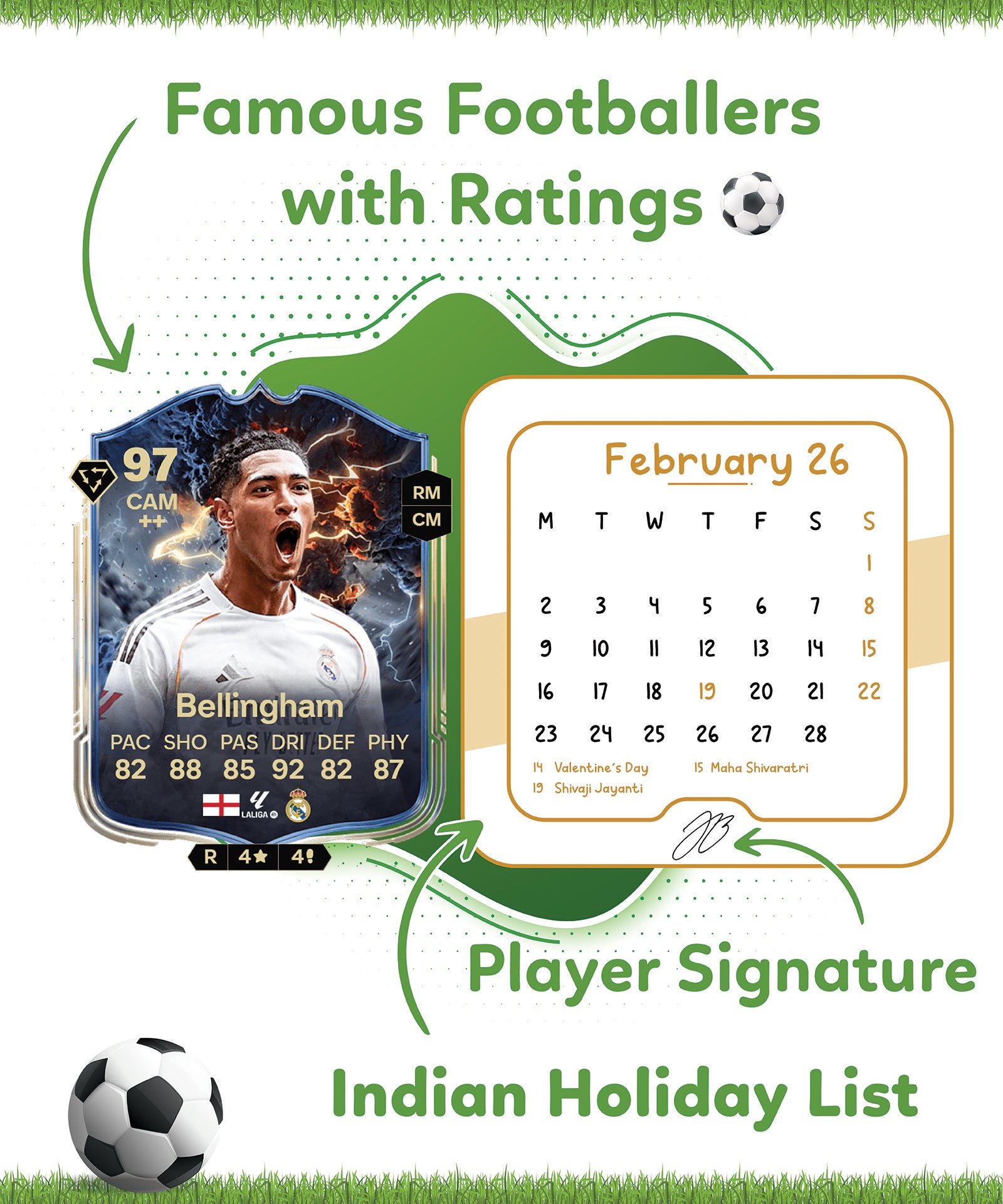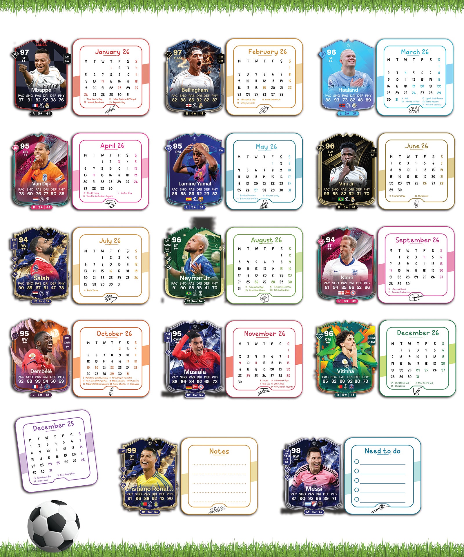 ⚽ Playful Design : Each month showcases popular football players with their performance ratings displayed in an engaging trading card style format that appeals to young football enthusiasts.